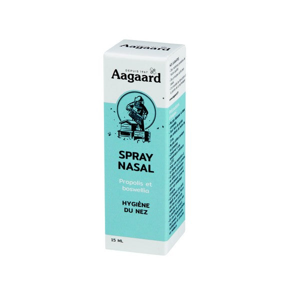 La propolis ne présente aucune incompatibilité avec d'autres thérapeutiques susceptibles d'être prescrites simultanément et aucune contre-indication proprement dite, seules les personnes allergiques aux produits de la ruche doivent prendre un avis médical avant d'entreprendre un traitement et éviter certaines voies d'administration.Tenir hors de portée des enfants. Fabricant Fabriqué en Allemagne 40 ans d'expérience et de recherche sur la propolis. Un procédé de purification original garantissant un panel de flavonoïdes et une quantité de cire adéquate. Des contrôles rigoureux de chaque lot de propolis. Une fabrication respectueuse de l'environnement par une entreprise certifiée GMP. Des actifs standardisés garantis pour votre confort et votre bien-être. Cahier des charges Les produits Aagaard sont fabriqués d'après les règles GMP rigoureuses de la WHO (World Health Organization). Les directives GMP sont des principes généraux qui doivent être observés lors de la fabrication de certains produits (médicaments, compléments alimentaires, cosmétiques), dans le but de garantir une qualité constante, fiable et irréprochable. Bénéfices Le spray nasal nettoie et assainit les fosses nasales en douceur. Il assure une bonne respiration. Le spray nasal à la propolis permet une hygiène parfaite du nez et aide à évacuer les sécrétions dues aux méfaits du froid. Sa formule enrichie en huile végétale biologique de sésame contribue à hydrater, adoucir et équilibrer l'humidité des muqueuses nasales sans les agresser. Le soin nasal lubrifie la muqueuse nasale sèche (hiver, air sec, …). De plus, il aide à évacuer les sécrétions dues aux méfaits du froid et apaise les irritations. Les vertus de la propolis renforcent ces effets.
