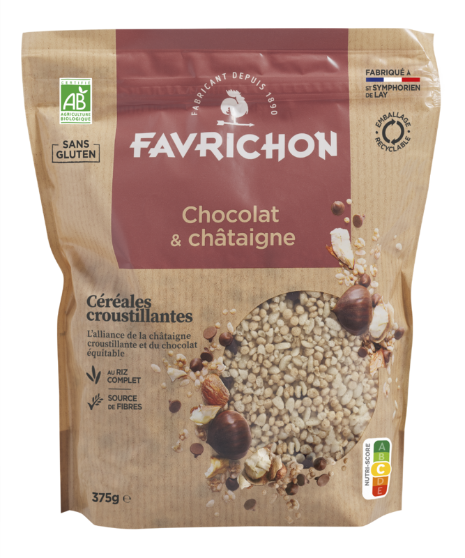 L’alliance originale de riz soufflé à la châtaigne et de pépites de chocolat fondantes.
