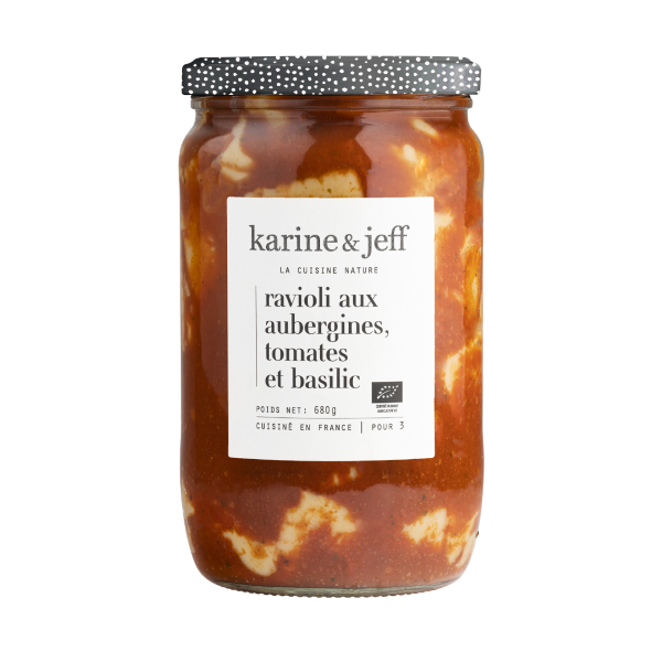 Sauce (83%) : tomates* (52%|orig. France), eau pure du parc régional du Haut-Languedoc, carottes* (orig. France), oignons*, parmesan* (lait), huile de tournesol première pression à froid* (orig. Sud-Ouest), sel de Guérande certifié Nature & Progrès, basilic* (0,2%), origan*, curcuma*, poivre*. Pâte (12%) : semoule de blé dur* (gluten), eau. Farce (5%) : chapelure* (farine de blé* (gluten), levure de bière*, sel), caviar d'aubergines* (2,6%|aubergines*, eau, oignons*, concentré de tomates*, huile de tournesol*, sel de Camargue, sucre de canne roux*, ail*, huile d'olive vierge extra*, thym*, laurier*, basilic*, marjolaine*, poivre*, piment*), huile de tournesol*.