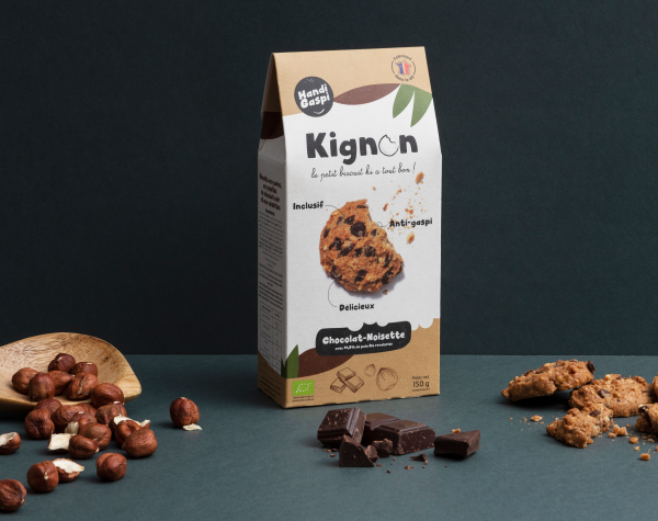 Des pépites de chocolat noir et des éclats de noisettes dans un biscuit bio aux pains, à la croustillance unique.