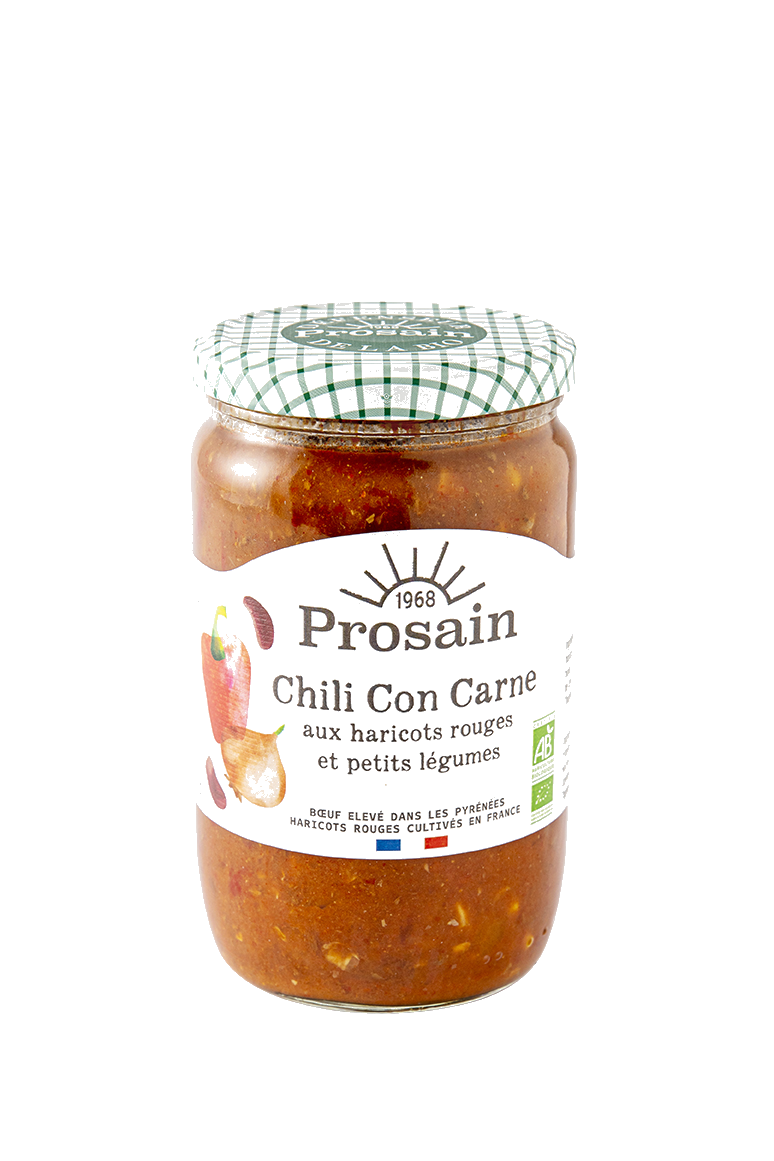 Tomate* (pulpe*, concentré*), eau, viande de bœuf* 17%, haricots rouges réhydratés* 9%, maïs* 7%, poivrons*, oignons*, carottes*, huile d'olive* vierge extra extraite à froid, sel de mer, épices* 0,65% (dont piment de Cayenne* 0,025%).